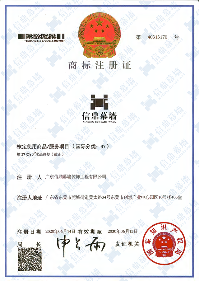 广东信鼎幕墙装饰工程有限公司自成立以来,始终高度重视企业品牌建设,努力维护商标的专用权。随着我司的知名度的扩大,为树立企业优秀形象,满足新的市场发展,我司不断地强化商标意识,为保障商标权益不受侵害,因此对“信鼎幕墙”商标申请注册。此次“信鼎幕墙”商标注册证的成功申请,标志着我司在品牌发展的道路上迈出了坚实的一步。