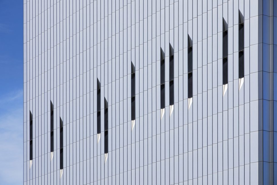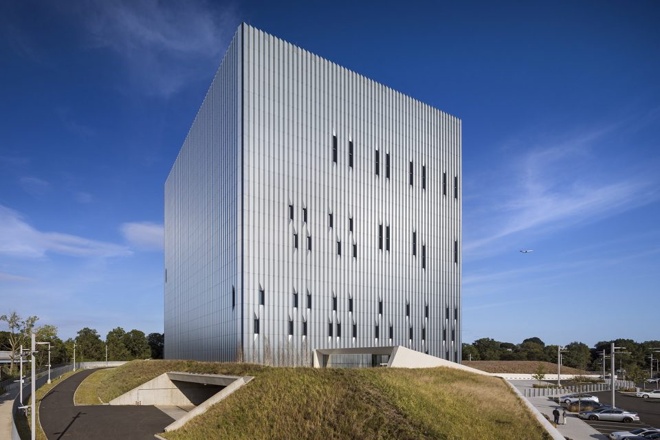 办公大楼坐落在布朗克斯、佩勒姆公园大道和哈钦森河公园的交汇处。幕墙设计师通过设计,同时也结合了建筑的功能性和安全性,为城市环境做出了积极的贡献。由于办公大楼的服务性质相对比较特殊,幕墙设计师在进行幕墙设计的过程中,除了要考虑把建筑外观设计成一个完美的立方体之外,出于安保方面的考虑,建筑几乎没有窗户。为了缓和建筑略显单调的整体性外墙,幕墙设计师为大楼的幕墙设计了具有特色的铝单板幕墙,赋予建筑更加生动、富于变化的立面。